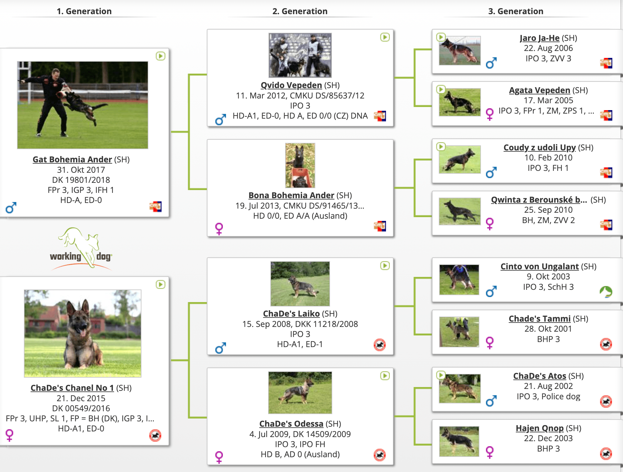 Knap middelstor, middelkraftig, dejlig tør og fast, grå pigmenteret han. Særdeles smukt pigment, særdeles god type, udtryksfuldt hoved, god manke og ryg, lidt kort afskydende kryds, særdeles godt vinklet for og bag. Kort underbryst, lidt udad drejede albuer, parallel bag, regelmæssige gode bevægelser. Rosværdigt mod og kampdrift.