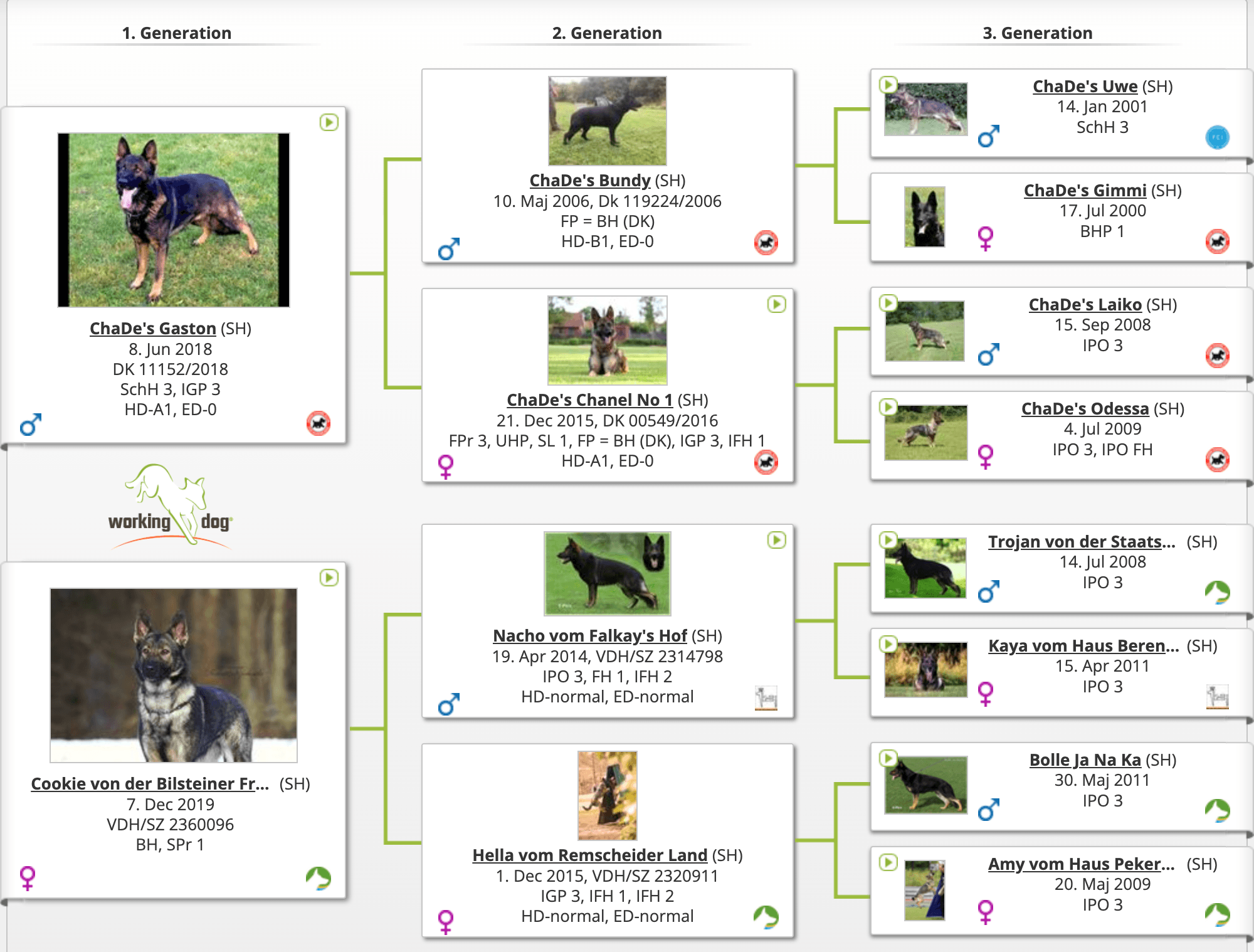 Knap middelstor, middelkraftig, dejlig tør og fast, grå pigmenteret han. Særdeles smukt pigment, særdeles god type, udtryksfuldt hoved, god manke og ryg, lidt kort afskydende kryds, særdeles godt vinklet for og bag. Kort underbryst, lidt udad drejede albuer, parallel bag, regelmæssige gode bevægelser. Rosværdigt mod og kampdrift.